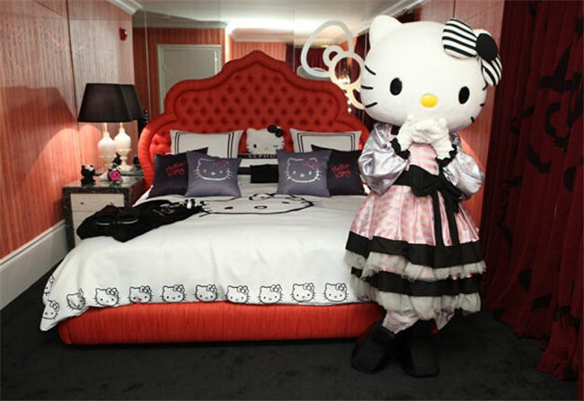 レストランの他に、特色あるホテルでもハロー?キティの人気が見られる。米國?カリフォルニア州ビバリーヒルズのあるホテルでは特別にハロー?キティをテーマにした客室をオープンした。室內(nèi)ではあちこちでハロー?キティを見ることができる。