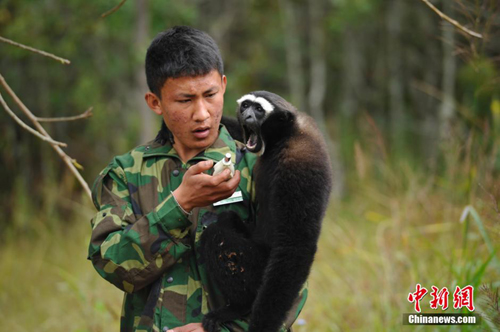 マミジロテナガザルを抱っこして叫び聲も測定中