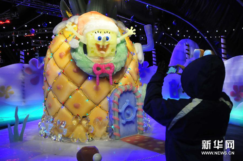 氷彫刻フェスティバルのテーマは「氷雪の島~スポンジ?ボブ」で、中國のハルビンから彫刻の大家31人が參加。45日間をかけて、重さ900トンの氷6000個(gè)を使って、50の美しい氷彫刻を披露した。