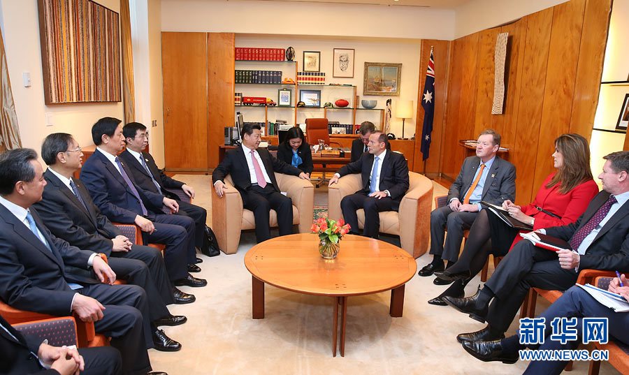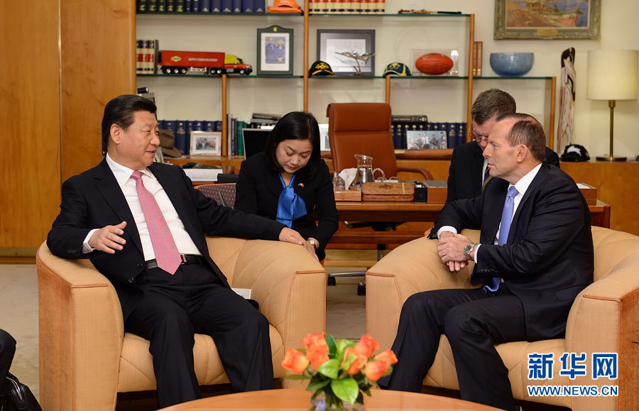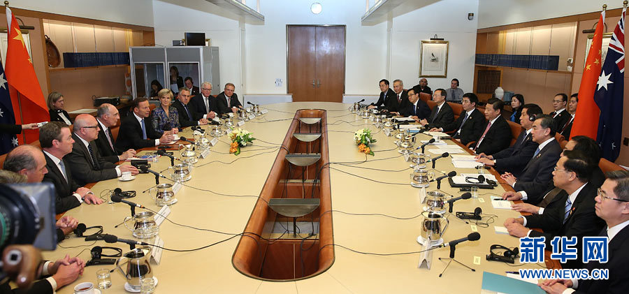 習(xí)近平國(guó)家主席は17日、オーストラリアのアボット首相とキャンベラで會(huì)談した。両首脳は中豪関係を包括的?戦略的パートナーシップに格上げすることを決定。自由貿(mào)易協(xié)定(FTA)交渉の実質(zhì)的妥結(jié)を宣言した。