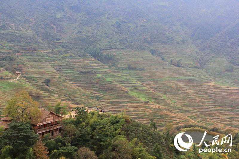 ひとつ目は「大地飛歌」。360度のパノラマがひろがる展望臺からは、ネット上で「世界で最も美しい十大棚田」と讃えられる篁嶺棚田をくっきりと望むことができる。