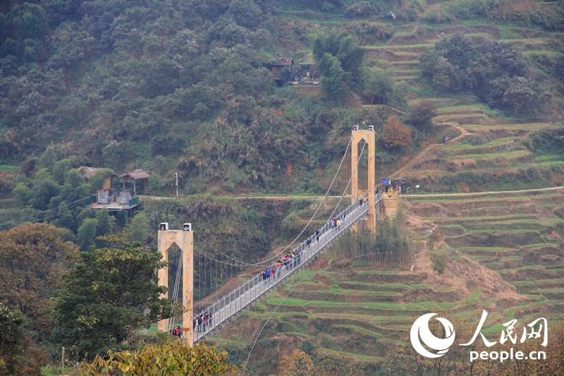 ふたつ目は「空中散歩」---全長186メートルの臥雲(yún)吊り橋は江西省最長の吊り橋だ。