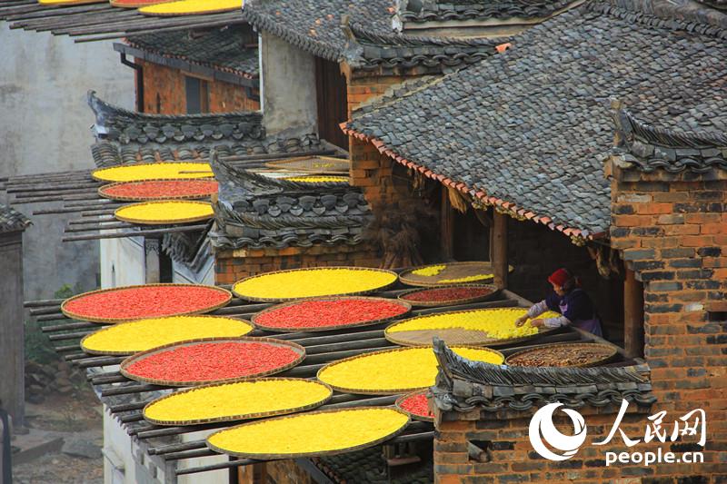 そして「天上人間」。篁嶺は乾隆、嘉慶、道光の三代皇帝が指揮した王朝を支えた曹文植、曹振鏞?父子の故郷。遡上平和の遺風(fēng)を受け継ぎ、篁嶺の人々は數(shù)百年にわたり竹製の篩いで農(nóng)作物を干してきた。春は茶葉?わらびを、夏はナス?インゲン豆を、秋はコメ?トウガラシを干す---場所を取らず、保存にも利點がある。よって「曬秋」の風(fēng)習(xí)が「最も美しい中國のシンボル」に入選した。