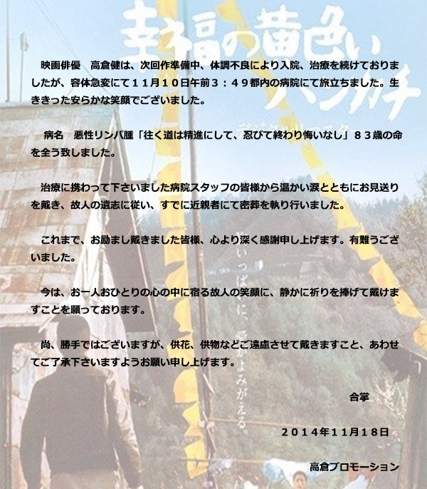 任俠映畫の「健さん」として一時代を築き、「幸福の黃色いハンカチ」「鉄道員」など寡黙で一本気な「日本の男」を演じ続けた俳優(yōu)で、文化勲章受章者の高倉健さんが10日、悪性リンパ腫のため、都內(nèi)の病院で死去した。83歳だった。>>