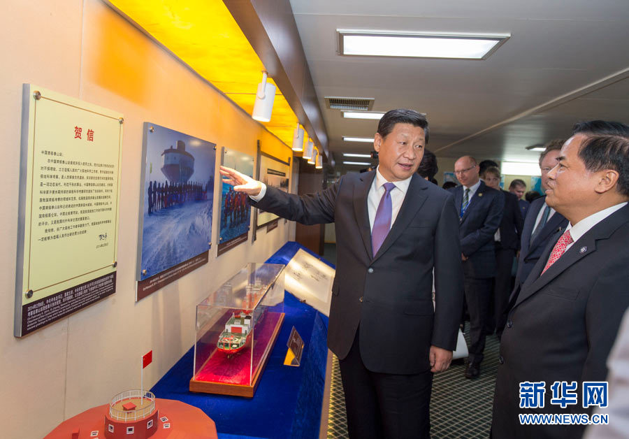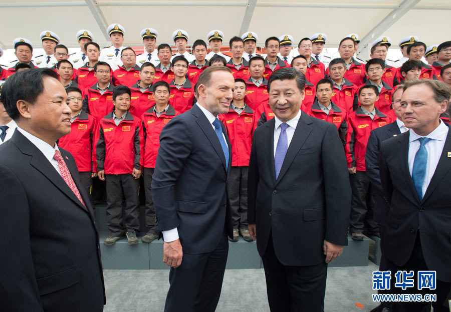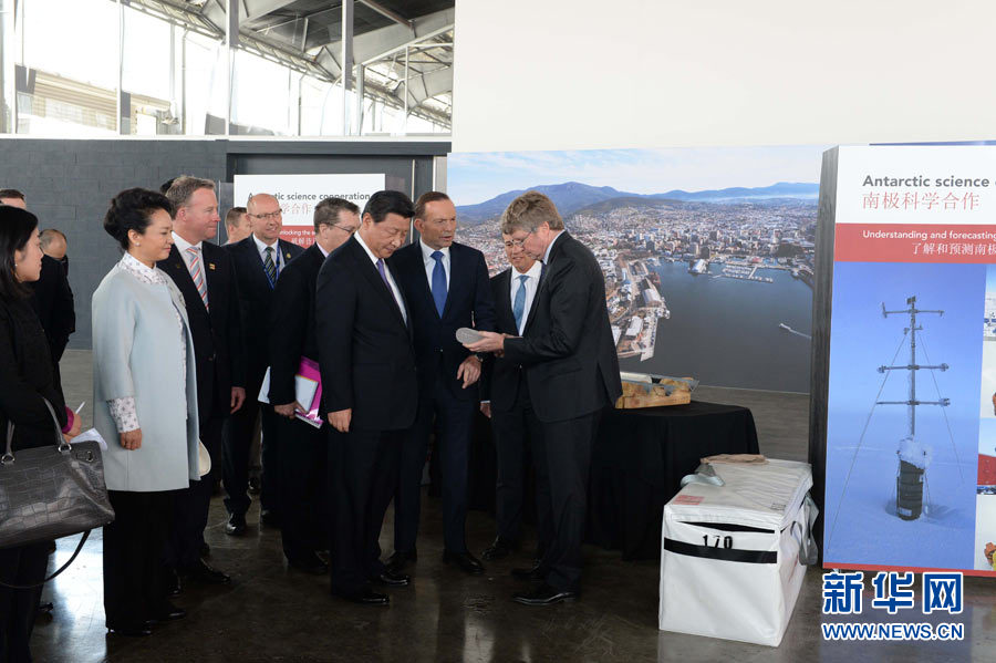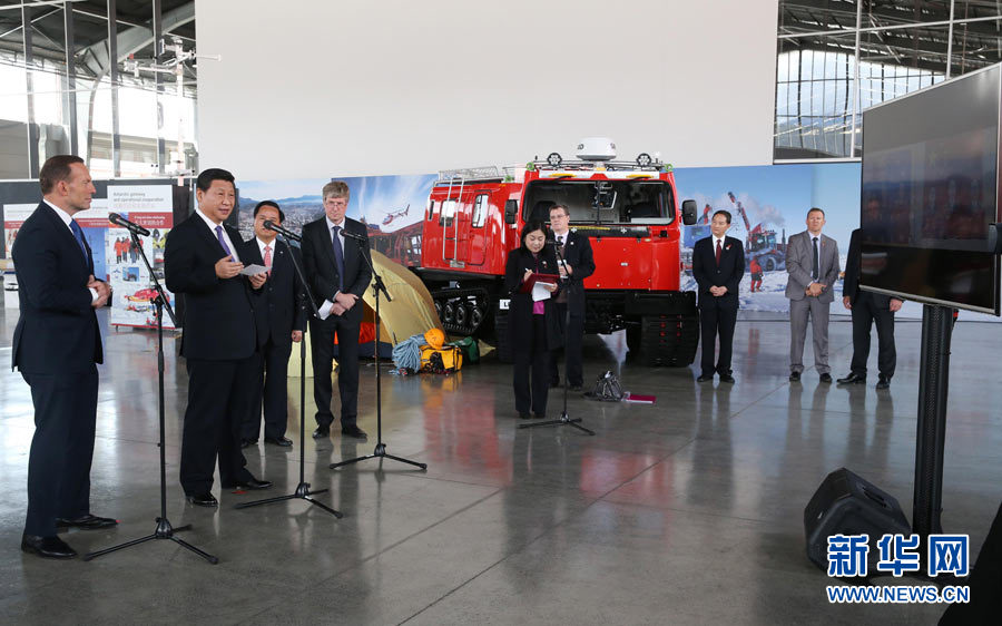 習(xí)主席とアボット首相は港エリアで、オーストラリア南極観測(cè)事業(yè)の展示を見學(xué)。両國(guó)の南極観測(cè)隊(duì)員と映像をつないで會(huì)話した。中國(guó)の中山南極観測(cè)基地、オーストラリアのデービス観測(cè)基地の責(zé)任者がそれぞれ活動(dòng)について報(bào)告した。
