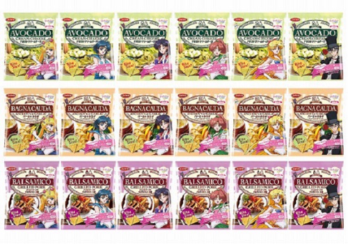 新発売のこのスナックは18種類のパッケージがあり、作中のヒロイン5人(セーラームーン、セーラーマーキュリー、セーラーマーズ、セーラージュピター、セーラーヴィーナス)が登場する。