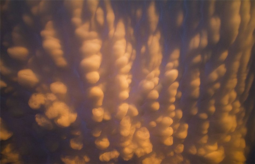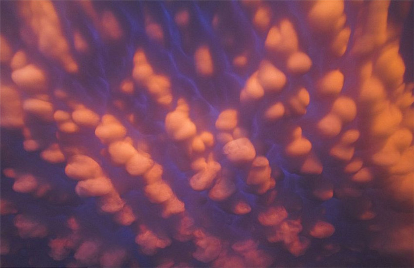 これらの驚くべき寫真には160キロに及ぶの長(zhǎng)い雲(yún)が寫っており、気泡緩衝材が空を覆っているようである。無(wú)數(shù)の泡のような雲(yún)は嵐が過(guò)ぎた後の日沒(méi)時(shí)に現(xiàn)れた。これは「乳房雲(yún)」と呼ばれる非常に珍しい現(xiàn)象である??栅蔚亭の恢盲摔ⅳ毪郡?、日光が照っている時(shí)だけ現(xiàn)れる。