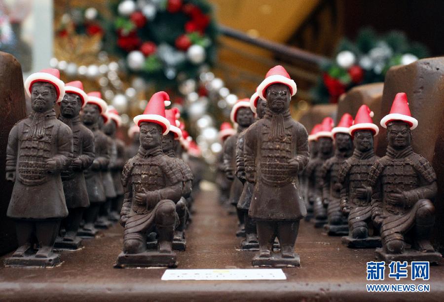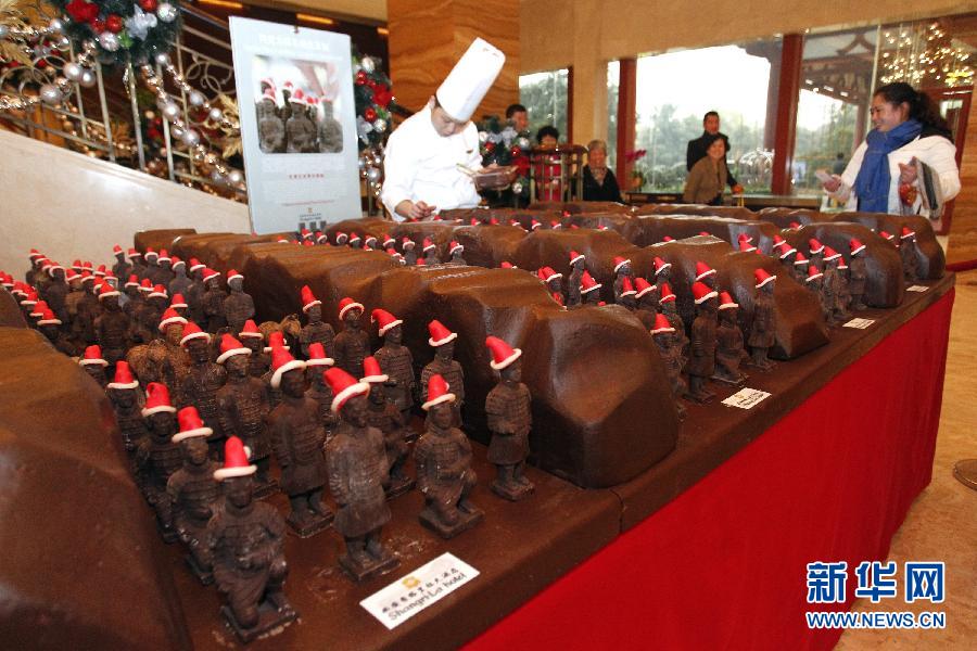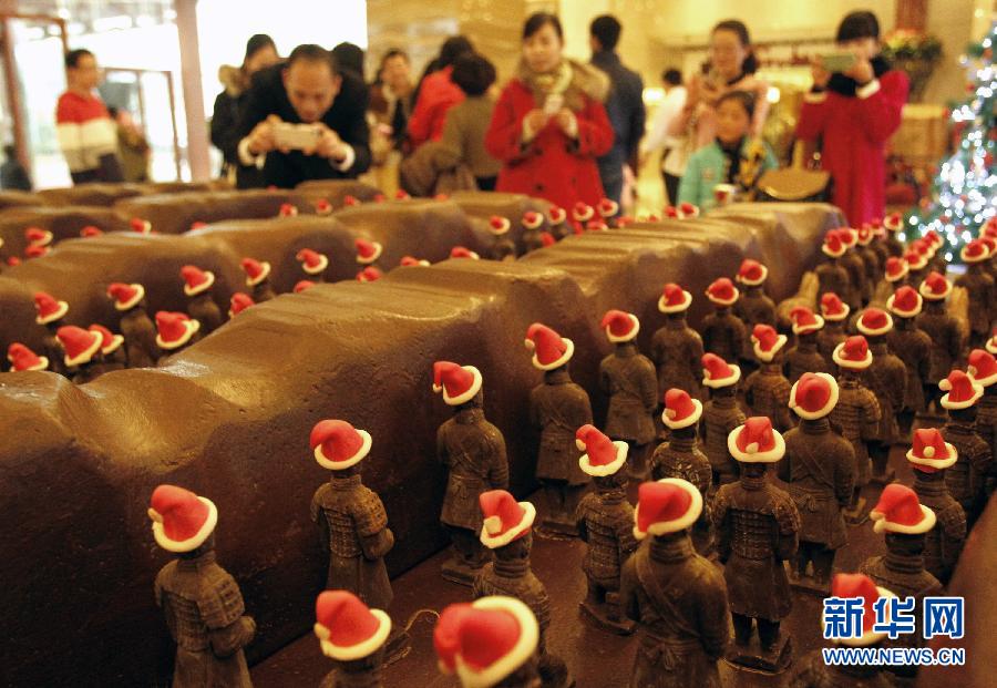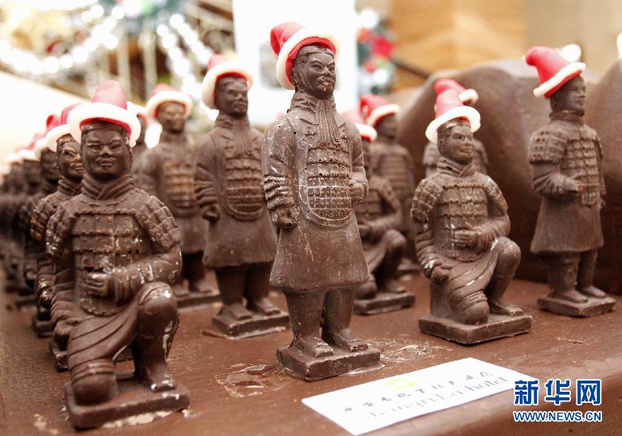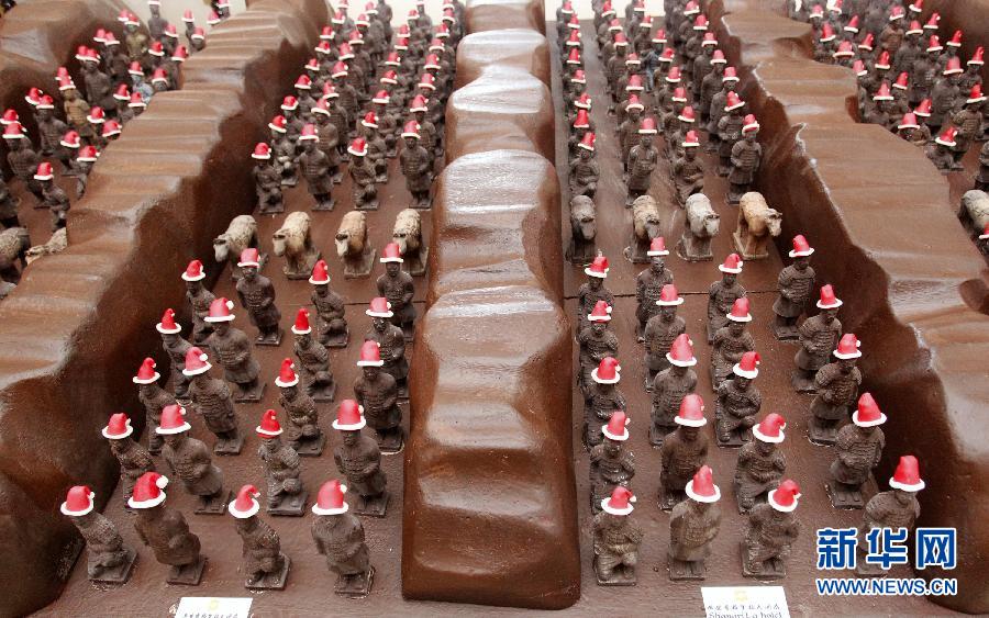 寫真は23日に撮影されたチョコレートの兵馬俑。クリスマスを迎えるために、陝西省西安市のシャングリラホテルのパティシエ10人が10日間をかけて、100キログラムのチョコレートで作った、サンタクロースの帽子をかぶったミニチュアの兵馬俑の模型300體がこのほど同ホテルで公開され、注目を集めた。新華網(wǎng)が伝えた。(編集YH)