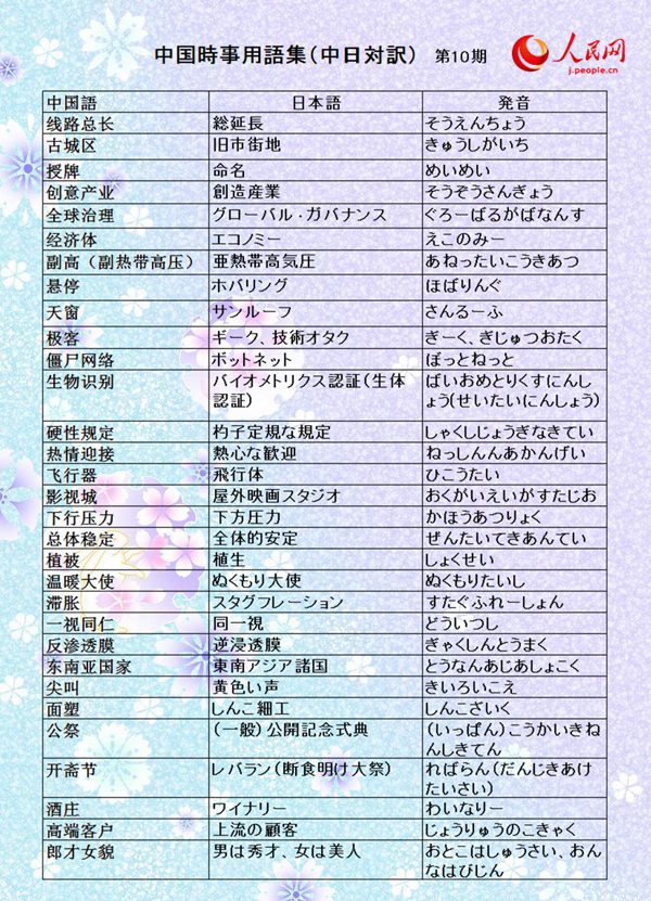 人民網(wǎng)日本語(yǔ)版は、中國(guó)の新聞報(bào)道を翻訳した記事を理解する上での手助けとなるため、「中國(guó)時(shí)事用語(yǔ)集(中日対訳)」を開(kāi)設(shè)しました。「中國(guó)時(shí)事用語(yǔ)集(中日対訳)」には中國(guó)の新聞報(bào)道に使用される政治?経済?社會(huì)?文化?法律などの用語(yǔ)を幅広く収録し、定期的に更新する予定です。読者の皆様のお役に立てれば幸いです。