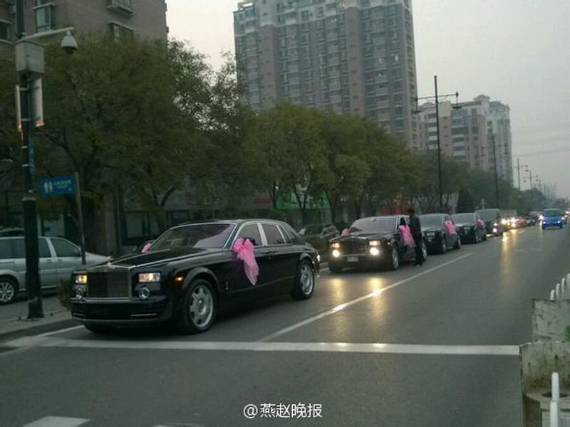 豪華なオートバイが先導(dǎo)し、赤いフェラーリが先頭に立ち、ロールス?ロイス?ファントム30臺(tái)からなるパレードが続く。これは高級(jí)車の流動(dòng)展示會(huì)ではなく、唐山市の街角に登場(chǎng)した豪華な結(jié)婚式の車のパレードだ。時(shí)価2億元(約38億円)以上に相當(dāng)するこれらの車のパレードが23日に街角に姿を見せると、たちまち通行人を驚かせ、寫真がすぐにインターネットにアップされた。また結(jié)婚式會(huì)場(chǎng)に姿を見せた有名人たちの姿に、ネット利用者は「すごすぎる」と感嘆の聲を上げている。燕趙都市報(bào)が伝えた。(編集YH)