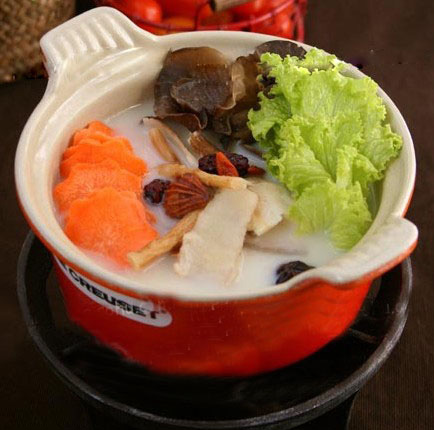 ▽材料:豚骨、クコ、黨參、ハスの実、トウキ、干しナツメ、豚バラ肉、干しキクラゲ、干しシイタケ、季節(jié)の野菜、塩、白コショウなど。