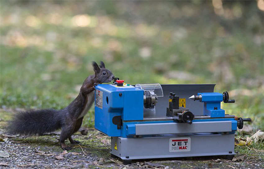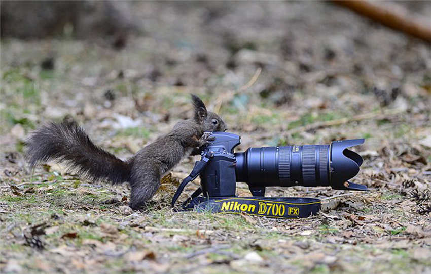 これらの寫真はウォーカー氏が注意深く配置した場面だ。ウォーカー氏は多くの小道具を準(zhǔn)備し、上に木の実を敷き詰め、リスがやって來るのを待ち受けた。リスたちが來るとウォーカー氏は木の実をどけ、好奇心の強(qiáng)いリスたちが小道具でユーモラスな場面を作るのを見守った。リスたちはカートやカメラ、電動器具などさえ動かして見せたという。