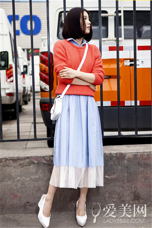 お手本コーデ:ライトブルーのワンピース+橙色のニットセーター+白ショルダーバッグ斜め掛け+白パンプス