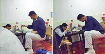 引退後、姚明さんは體重がさらに増えたようで、座っているイスがとても小さく見える。姚明さん自身も窮屈そうで、座り心地悪そうに、ラーメンを食べている。一方、姚明さんと向かい合って座っている男性は、足を組んでおいしそうにスープをすすっている。(編集KN)