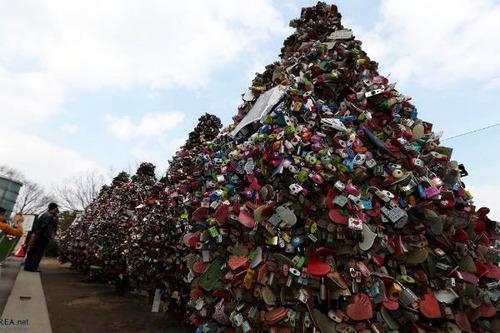 韓國ソウルの南山公園內(nèi)にあるNソウルタワーの名物も「愛の南京錠」。Nテラスの柵には、永遠(yuǎn)の愛を誓ったカップルが掛けた無數(shù)の南京錠がある。同タワーの展望臺からは、ソウル市內(nèi)全體を見渡すことができる。また、南京錠のカギを入れるための「愛のポスト」も設(shè)置されている。