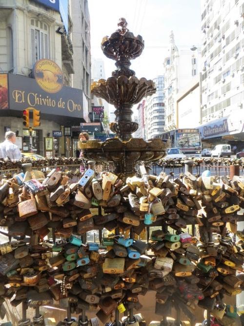 モンテビデオのメインストリートの一角にある噴水を囲むフェンスにも愛の南京錠が無數(shù)にかけられている。看板には、「カップルが2人のイニシャルを書いて、この柵にかけ、將來そのカップルが再びここに來ることができれば、2人の愛は永遠(yuǎn)にロックされる」と書かれている。