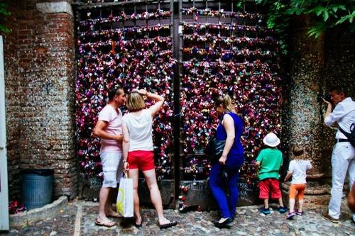 ヴェローナには、「ロミオとジュリエット 」の舞臺(tái)となった「ジュリエッタの家」があり、その門(mén)にも「愛(ài)の南京錠」が無(wú)數(shù)に掛けられている。また、入ってすぐのトンネルになっている部分には、落書(shū)きをしていいエリアがあり、さまざまな言語(yǔ)で、戀人の名前が書(shū)き殘されている。