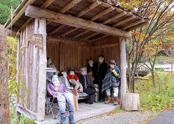 報(bào)道によると、徳島県三好市の名頃集落には、人口35人に対して100體以上のかかしがあちこちに置かれている。これらのかかしは、この集落の住民の中で最も若い綾野月美さん(65)が手作りしたもの。かかしは農(nóng)作業(yè)をしていたり、バス停でバスを待っていたりと、日常生活に溶けこんだ形で置かれているという。
