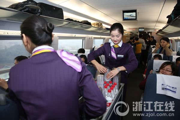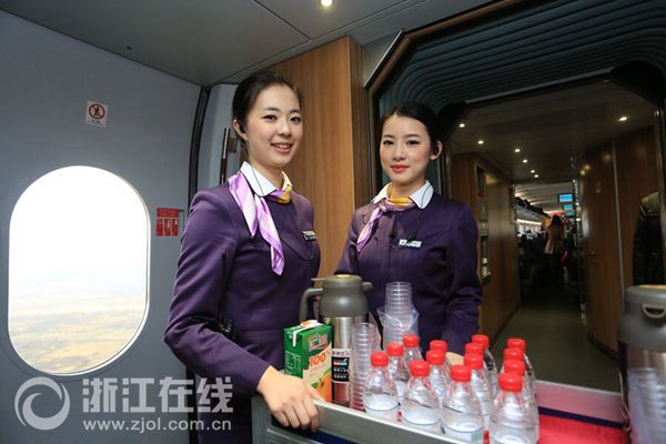 車內(nèi)では紫色の制服姿の客室乗務(wù)員が乗客にサービスを提供し、そのイメージと雰囲気は旅客機(jī)の客室乗務(wù)員にも劣らないと評(píng)判を集めた。(編集YH)