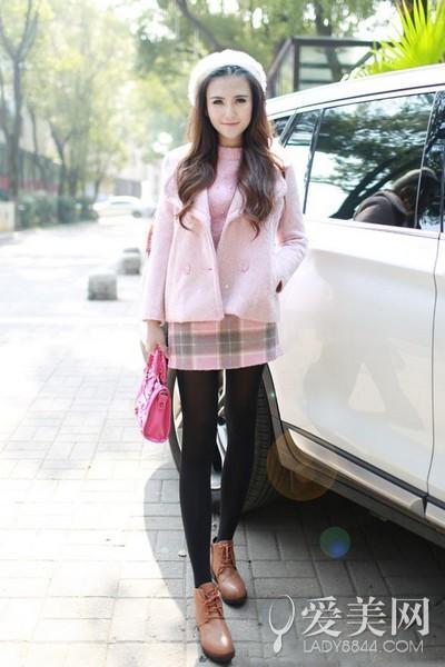 (2) ピンクのラウンドネックのセーターにピンクのチェック柄のスカート、ピンクのショートコート、茶色のショートブーツ、白いベレー帽、ピンクのバッグ。