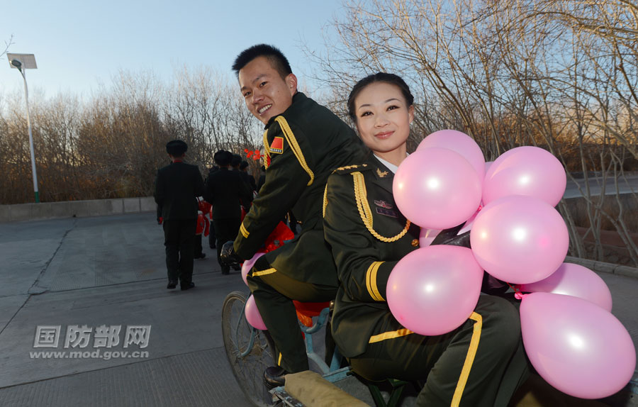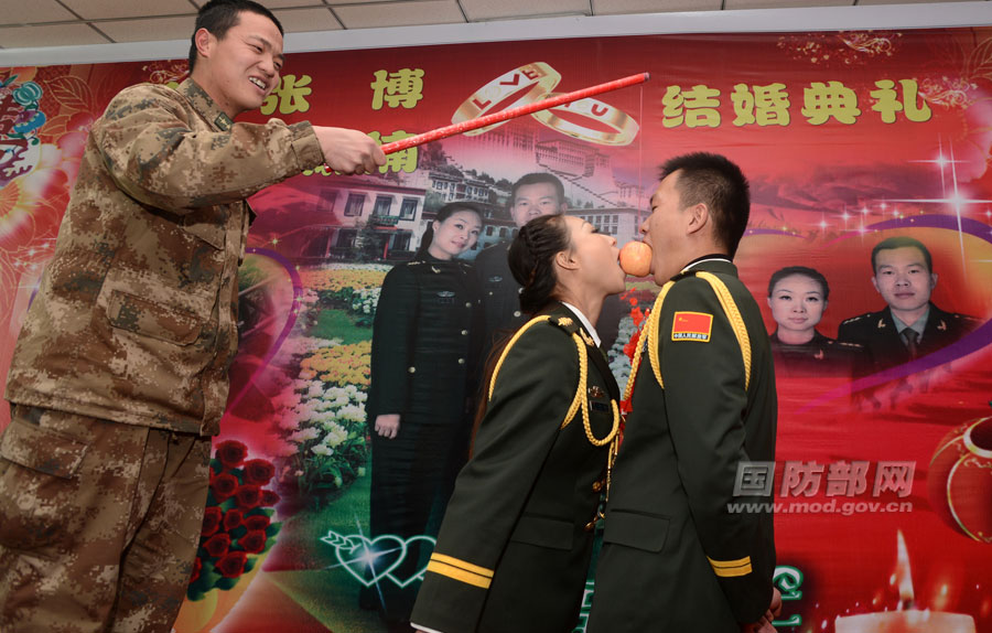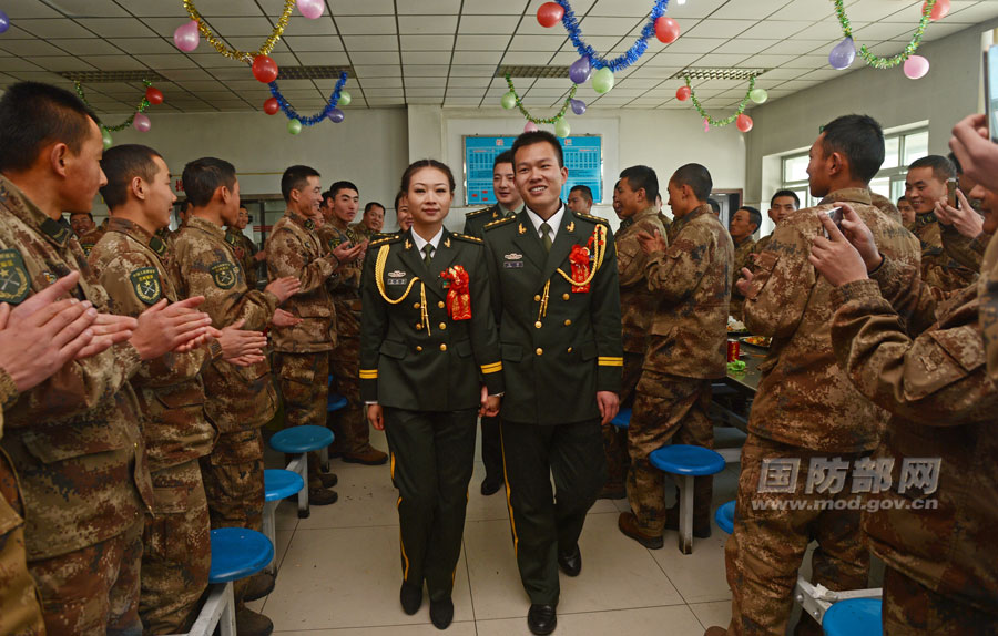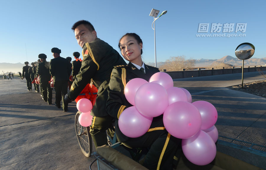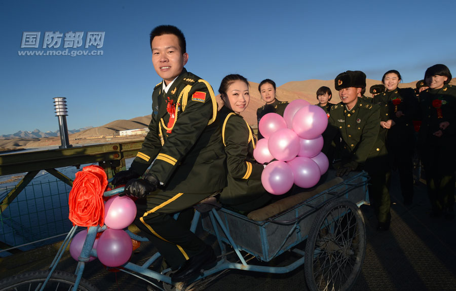 西蔵(チベット)自治區(qū)阿里高原の辺防部隊(duì)では11日、あるカップルの結(jié)婚式が行われた。新婦の梁淑楠さんは阿里軍分區(qū)醫(yī)療ステーションの看護(hù)師、新郎の張博さんは辺防団の偵察関係の幹部だ。この雪の高原で戀に落ちて4年になる2人の辺防軍人は、戦友たちの祝福の聲に包まれる中、海抜4300メートルの阿里の獅泉河鎮(zhèn)で結(jié)婚した。新郎新婦が共に軍人の結(jié)婚式は阿里ではここ數(shù)年で初めてだという。國(guó)防部網(wǎng)が伝えた。(編集YH)
