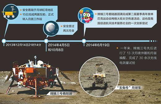 同センターの嫦娥3號(hào)任務(wù)主任設(shè)計(jì)者の崔雁氏は、「月面著陸からの1年間において、嫦娥3號(hào)は13回のスリープとスリープ解除を?qū)g施し、夜の極寒環(huán)境という試練を乗り越えた。30數(shù)回の無(wú)線(xiàn)電測(cè)量試験において、地上の科學(xué)者は処理?分析により高精度の測(cè)量データを取得し、同センターの深宇宙干渉?測(cè)量システムの性能を裏付けた。また同センターの行き屆いた計(jì)畫(huà)に基づき、嫦娥3號(hào)著陸モジュールは2014年6月19日に、第2回夏季ユース五輪の聖火リレーに宇宙から加わった。これは宇宙技術(shù)の社會(huì)貢獻(xiàn)を促進(jìn)する、中國(guó)の新たな試験的取り組みだ」と説明した。