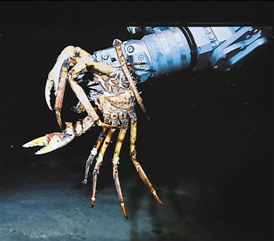 海底の巖石に隠れていた蟹が、有索式無人探査機(jī)のロボットアームによって捕獲される様子