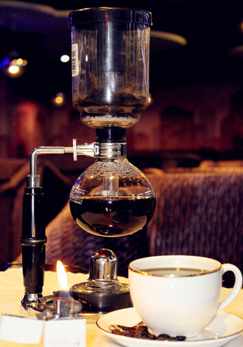 サイフォン式コーヒーは、シンプルかつ便利なコーヒーの抽出方法の一つで、水を加熱した後、発生する水蒸気と冷卻された水蒸気の凝結(jié)を利用した原理を用いている。加熱した下側(cè)の球體の容器の湯が上の壺に上がり、水蒸気から水へ凝結(jié)することにより減圧が起き、大気圧により上側(cè)の容器から下の容器に抽出されたコーヒーが押し戻される。(編集MZ)