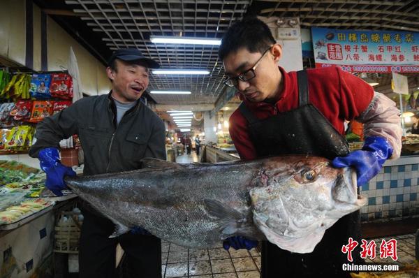 長さ1.46メートル、重さ50キログラムを超える「怪魚」が14日、青島市の野生魚専売店の店先に登場(chǎng)、多くの市民がこの「怪魚」を取り囲んだが、この魚の正體を知る人は誰一人おらず、長年漁業(yè)に従事する漁師ですら首をかしげた。この魚は12日早朝、膠州の漁師が渤海灣で漁をしている際に網(wǎng)にかかったが、珍しく重さ約10キログラムサザンフラウンダーも同時(shí)に水揚(yáng)げている。名前が分からないため価格も決められず、現(xiàn)在この大きな魚は一時(shí)的にこの野生魚専売店に置かれ「保留」となった。中國新聞網(wǎng)が伝えた。(編集YH)