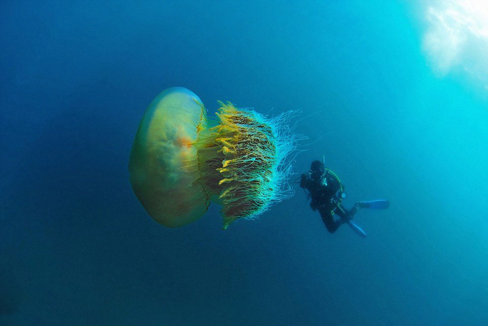 寫真は巨大なエチゼンクラゲ。ブラジルのカメラマン、ルシア?トロイさんが日本の越前海岸でダイビング中に撮影した。(編集YH)