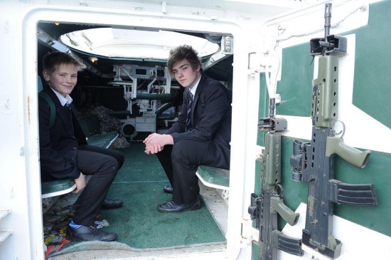ある父親が、2人の息子が雨の日も風(fēng)の日も時(shí)間通り學(xué)校に行けるよい方法を思いついた。毎日重さ17トンの裝甲車を操縦して送り迎えするという方法である。息子たちが座るシートは大雪が降っても全く問題ない。この父親によると、息子の同級(jí)生は裝甲車を見るたびに呆気にとられるという。また、「交通規(guī)則に違反したことはない」と話している。