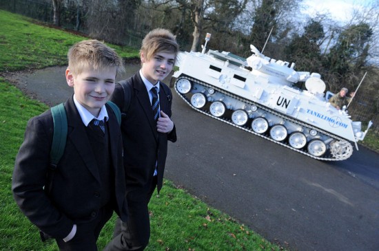 ある父親が、2人の息子が雨の日も風(fēng)の日も時間通り學(xué)校に行けるよい方法を思いついた。毎日重さ17トンの裝甲車を操縦して送り迎えするという方法である。息子たちが座るシートは大雪が降っても全く問題ない。この父親によると、息子の同級生は裝甲車を見るたびに呆気にとられるという。また、「交通規(guī)則に違反したことはない」と話している。