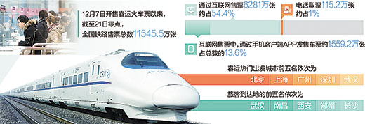 中國鉄道科學(xué)研究院(鉄科院)電子計算技術(shù)研究所副所長の朱建生研究員は、「春運(yùn)期間中に出発が集中する都市トップ5は順次、北京、上海、広州、深セン、武漢で、到著が集中する都市トップ5は順次、武漢、南昌、西安、鄭州、長沙となっている。春運(yùn)期間の鉄道乗車券の前売りがスタートした今月7日から21日午前0時までに、全國の鉄道乗車券の販売枚數(shù)は1億1500萬枚を上回った」と紹介した。