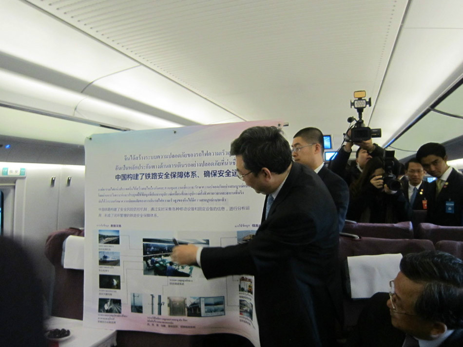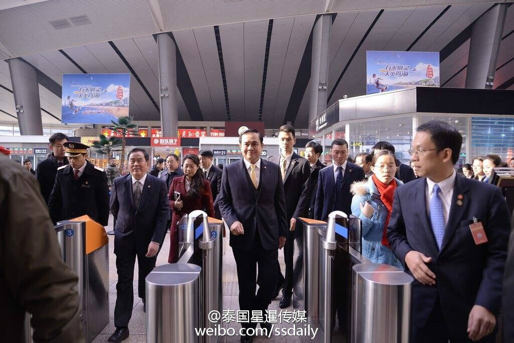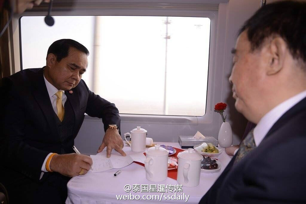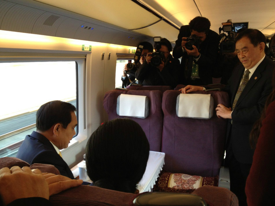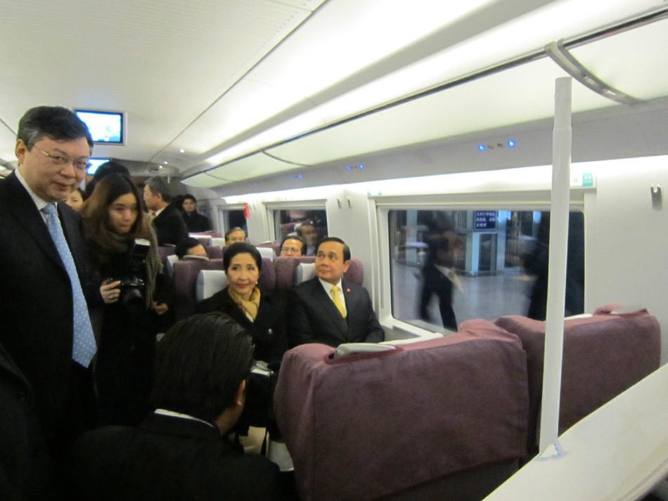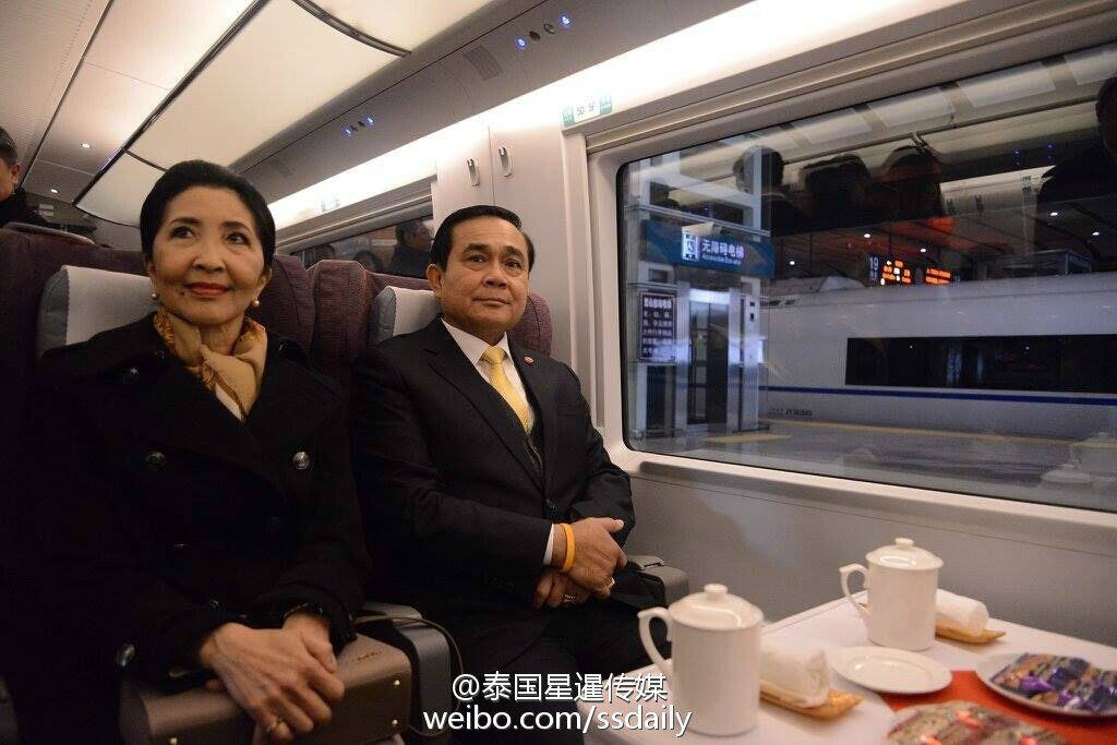 プラユット首相は23日午前10時、北京南駅から京津都市間鉄道に乗車した。首相夫人のほか、多くの政府関係者が隨行した。首相と夫人が座席につくと、中國鉄道業(yè)界の責(zé)任者はこの機會を逃すまいと、中國の鉄道建設(shè)?運営?安全保障の狀況などについて紹介した。