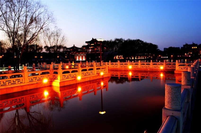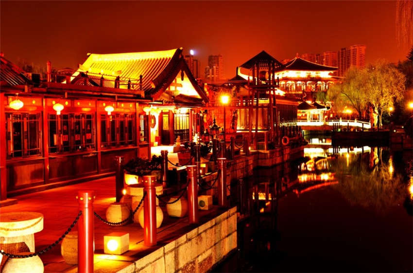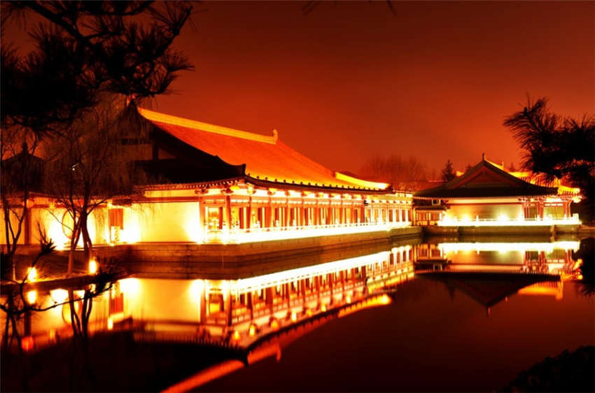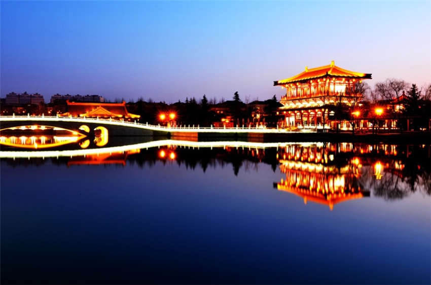 西安?大雁塔の東にある大唐芙蓉園は、唐代の最も栄えた時(shí)代をあらゆるアングルから展示した中國初の大型皇家園林式文化テーマパーク。夜景にたたずむ大唐芙蓉園には、神秘的色彩がいっそう際立つ。(編集HT)