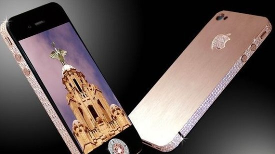 英國(guó)の寶石デザイナーStuart Hughes氏のデザインしたiPhone4は、裏面のガラスパネルがローズゴールドに替えられ、アップルのロゴもダイヤのかけらで光を放っている。本體も500粒のフローレスダイヤで覆われ、ダイヤの総重量は約100カラットに達(dá)する。販売価格は400萬(wàn)ポンドで、世界最高級(jí)の攜帯電話と言えるだろう。