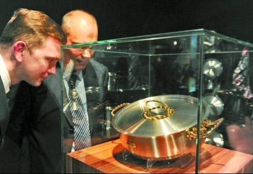 このステンレス製の鍋、取っ手が18金で作られ、さらに270粒13カラットのダイヤが散りばめられている。