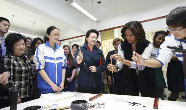 場景:「中國書道は余りにも美しい。今後もっと練習(xí)しなければ」。米國のファーストレディー、ミシェル夫人は初の単獨(dú)訪中で、習(xí)主席の彭麗媛夫人と共に北京市內(nèi)の學(xué)校で書道の腕前を披露した。ミシェル夫人は「永」と書いて彭麗媛夫人に贈(zèng)り、彭麗媛夫人は返禮に「厚徳載物」と書いた。彭麗媛夫人がミシェル夫人に筆の持ち方の手本を示している場面が放送されると、全世界の注目を集めた。