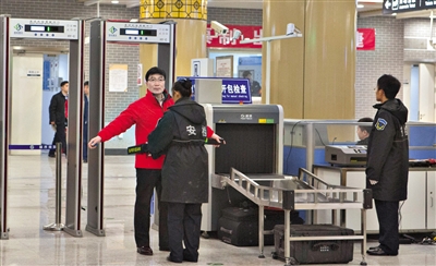29日,地下鉄7號(hào)線磁器口駅で、セキュリティ検査を行う駅員。