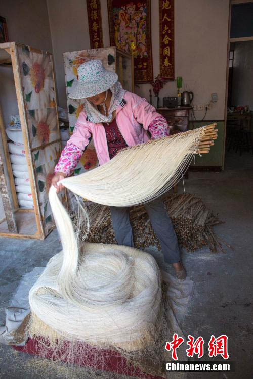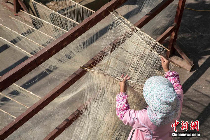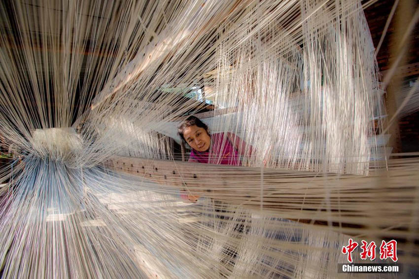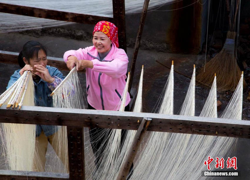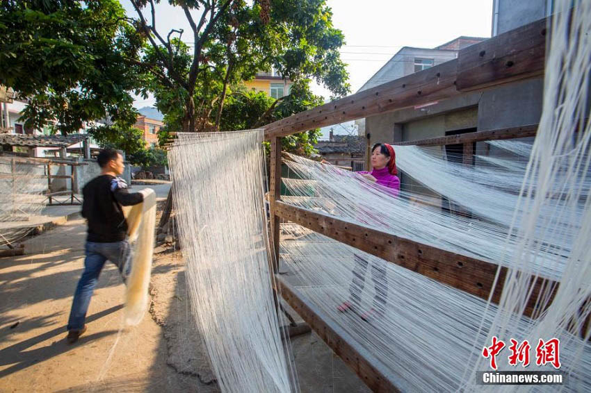 福建省閩侯県荊溪鎮(zhèn)関東村では29日、冬の暖かい日差しの下で麺を干す姿が各家庭で見られた。この地で作られた麺は人気も高く、乾麺はその日のうちに予約が入り販売用に捌かれていく。福州住民は大晦日の夜に乾麺を食べる習(xí)慣がある。この地の麺は麺類の中で最も長いため「長壽麺」とも呼ばれ、長壽や富など縁起のよい意味を持ち、幸せな生活に対する願いもこめられている。中國新聞網(wǎng)が伝えた。(編集YH)