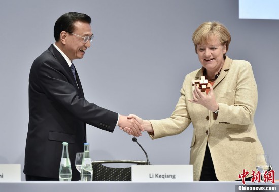 10月10日、中獨経済技術(shù)協(xié)力フォーラムで、李克強総理は精巧に作られた中國パズル「魯班鎖」をドイツ?メルケル首相に贈った。