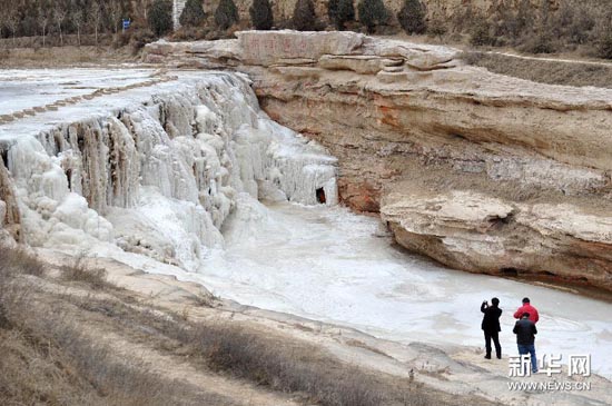 寫真は5日、寧夏回族自治區(qū)固原市彭陽(yáng)県內(nèi)の茹河で、凍った滝を見る観光客。連日の低溫で川の水が凍結(jié)し、多くの観光客がこの美しい奇観を一目見ようと足を運(yùn)んでいる。新華網(wǎng)が伝えた。(編集YH)