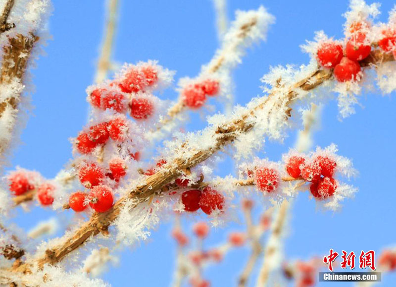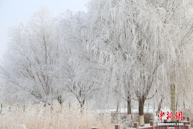 「三九天」(舊暦の冬至から9日ずつ數(shù)えて3番目の9日間を指す。極寒の時(shí)期)の寒波が訪れ、新疆維吾爾(ウイグル)自治區(qū)博湖県の広い範(fàn)囲で樹氷が発生した。市街地や郊外でまるで絵畫のような様々な美しい樹氷の光景が広がった。同県の百信公園では9日、樹氷で煌く柳や松、柏などが人々を魅了した。中國新聞網(wǎng)が伝えた。(編集YH)