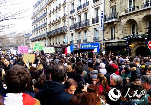 ヘリコプターからの映像を後で見ると、デモ開始の午後3時前に広場はいっぱいになり、放射狀に広がる道は押し寄せる人々であふれていた。ラジオでは今回の集まりを「解放以來」の規(guī)模と表現(xiàn)していた。ファシズムドイツの4年にわたる占領(lǐng)から解放された1944年8月、パリは歓喜に湧き、人々が町に出てきた。今回のデモをそれと比べるのは大げさかもしれない。しかし水曜に始まった一連の襲撃事件で不安にかられていたフランスの人々が、事件の一応の終息によって安堵のムードにあることは確かである。テロリストがまだ逃亡中であれば、デモの様相はまったく異なっただろう。