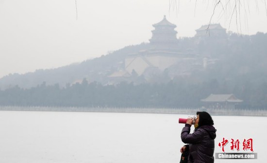 北京?頤和園の氷結(jié)した昆明湖の上では14日、マスクをした観光客が歩く姿が見られた。氷は2015年の初雪で覆われ、また煙霧も北京を覆い、遠(yuǎn)くの景色が見通せない狀況だった。北京の空気は同日、深刻な汚染レベルに達(dá)した。中國(guó)新聞網(wǎng)が伝えた。(編集YH)