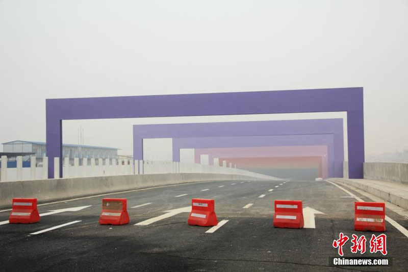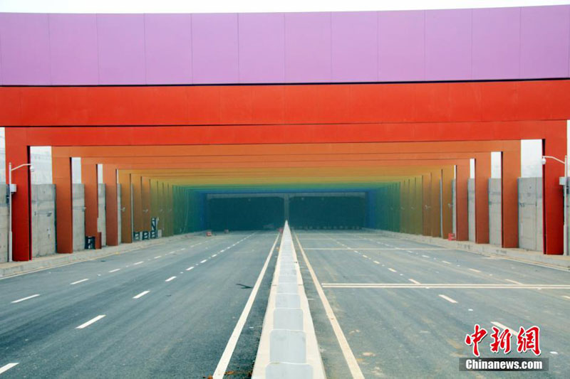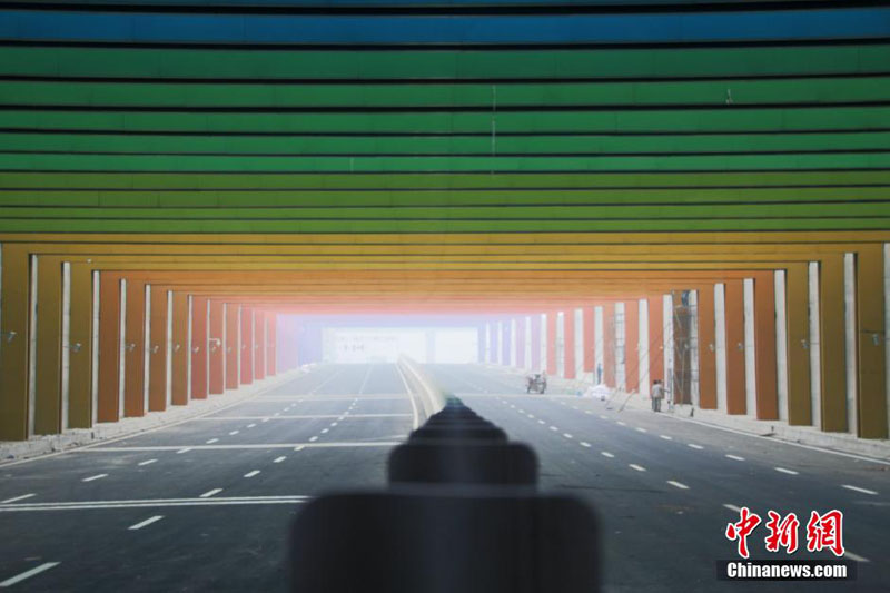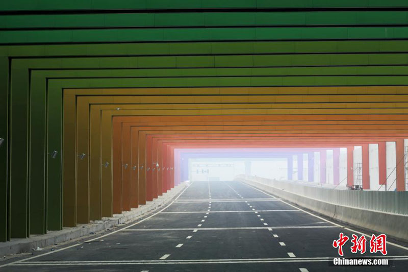 河南省鄭州市中牟県の鄭開大道とS223省道の交わるところにある「虹のトンネル」が注目を集めている。同トンネルは長さ約400メートルで、3段構(gòu)成となっている。中間部分は普通のトンネルと同様で、南北の両端が虹の色になっている。トンネル南端は44セット、北端は40セットの遮光板からなり、両端が12種類の色になっている。一番外側(cè)は紫色で、一番內(nèi)側(cè)の青色まで変化している?,F(xiàn)場の工事作業(yè)員によると、これは中國初かつ唯一の虹のトンネルで、1億元(約18億8千萬円)近くが投資されている?,F(xiàn)在、虹のトンネルはまだ完成していないが、工事完了後の適切な時(shí)期に開通する。中國新聞網(wǎng)が伝えた。(編集YH)