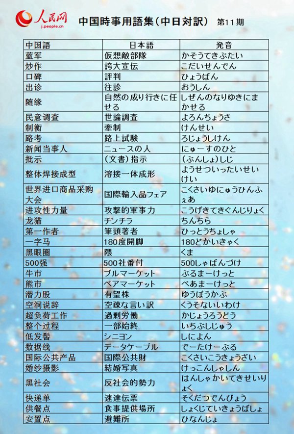 人民網日本語版は、中國の新聞報道を翻訳した記事を理解する上での手助けとなるため、「中國時事用語集(中日対訳)」を開設しました?!钢袊鴷r事用語集(中日対訳)」には中國の新聞報道に使用される政治?経済?社會?文化?法律などの用語を幅広く収録し、定期的に更新する予定です。読者の皆様のお役に立てれば幸いです。