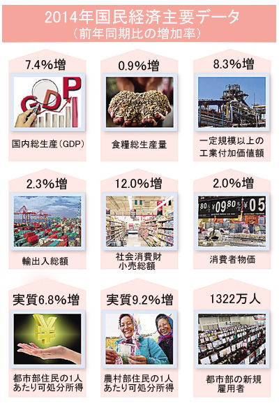 國家統(tǒng)計(jì)局は20日、2014年の國民経済の主な統(tǒng)計(jì)データを発表した。それによると、中國の14年の國內(nèi)総生産(GDP)は63兆6463億元(約1210兆円)で、初めて60兆元(約1140兆円)を突破した(速報(bào)値)。物価変動を除く実質(zhì)で、前年比7.4%増。國家統(tǒng)計(jì)局の馬建堂局長は「國民経済は新常態(tài)の中で安定的に推移しており、安定的な成長、構(gòu)造の最適化、質(zhì)の向上、國民生活の改善といった良い狀況が見られている」と指摘した。人民日報(bào)が伝えた。