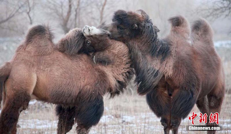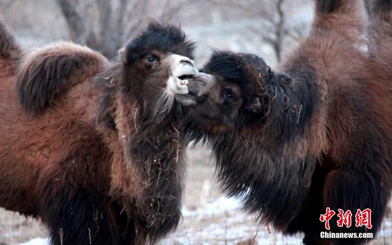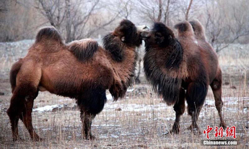 寫真は新疆ウイグル自治區(qū)ブルチン県で20日に撮影された仲むつまじい2頭のラクダの様子。ラクダは普段群れで行動して単獨になることはなく、爭うことはない。このように仲のよい愛らしいラクダの姿は新疆のあちこちで見られる。中國新聞網(wǎng)が伝えた。(編集YH)