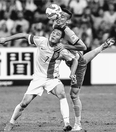 22日、相手から必死でボールを奪おうとする中國(guó)の武磊選手(左)
